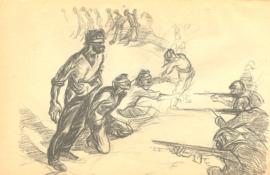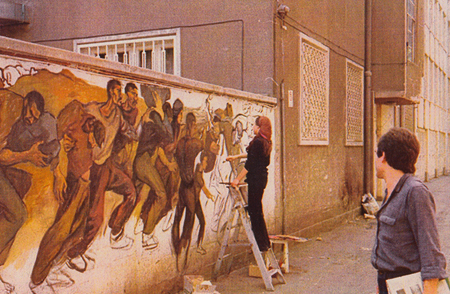ج: یکی از این نقاشیها را روی دیوار دانشکده هنرهای زیبا به همراه مسعود سعدالدین و الخاص کشیدیم. یک نقاشیدیواری بزرگی بود که بعداً آن را پاک کردند. در آن دوره انجمنهای کارگری هم وجود داشت که در روز کارگر ما به آنجا میرفتیم و بر در و دیوارش نقاشی میکردیم. ولی خیلی نمیماند و میآمدند پاک میکردند. یکی هم در کوچهی دربند عزیزی بود که محل زندگی خودم بود؛ نقاشیای کشیدم که عکسهایی از آن باقی مانده. در این عکسها، مردمی ایستادهاند و مشغول تماشای دیوارِ نقاشیشده هستند. انگار آدمهای نقاشی از دل تصویر بیرون آمدهاند و دارند خودشان را تماشا میکنند.