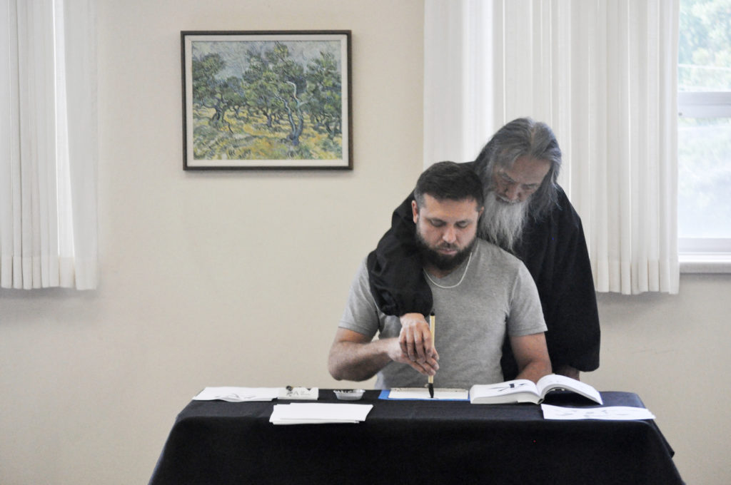 کازوآکی تاناهاشی در حال آموزش خوشنویسی